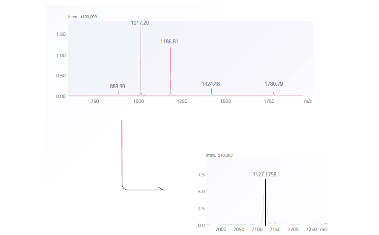 LCMS-2050的宽质量范围是测定大分子分子量的有力工具,例如寡核苷酸、多肽、蛋白质、聚合物等。例如,在 LCMS-2050上分析反义寡核苷酸诺西那生钠,会检测到m/z889到1781一系列的从4价到8价的去质子化离子峰。使用LabSolutions LCMS的去卷积功能,诺西那生钠的分子量计算为7127.1760,与理论值的误差为0.05 Da宽质量范围有利于这种类型的分析,因为包含了更多的解卷积峰使得分子量计算结果更可靠。